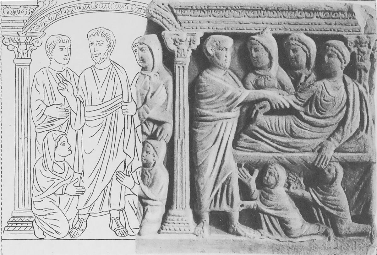 Raising of Tabitha, sarcophaus fragment, Musee de La’Arles Antique, 4th century AD. Giuseppe Wilpert. Rome: Pontificio Istituto di Archeologia Cristiana, 1929. Plate CXLV, no 6.
